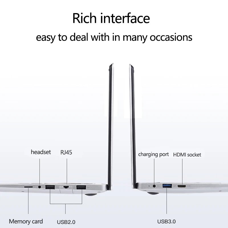 El ordenador portátil A8 está equipado con un puerto DC de alta velocidad, USB 3,0, USB2.0, mini-hdmi, Puerto DC de carga rápida, Conector de auriculares, ranura para tarjeta micro-sd, RJ45, ofrece conectividad sin complicaciones a los ordenadores portátiles para una flexibilidad versátil
