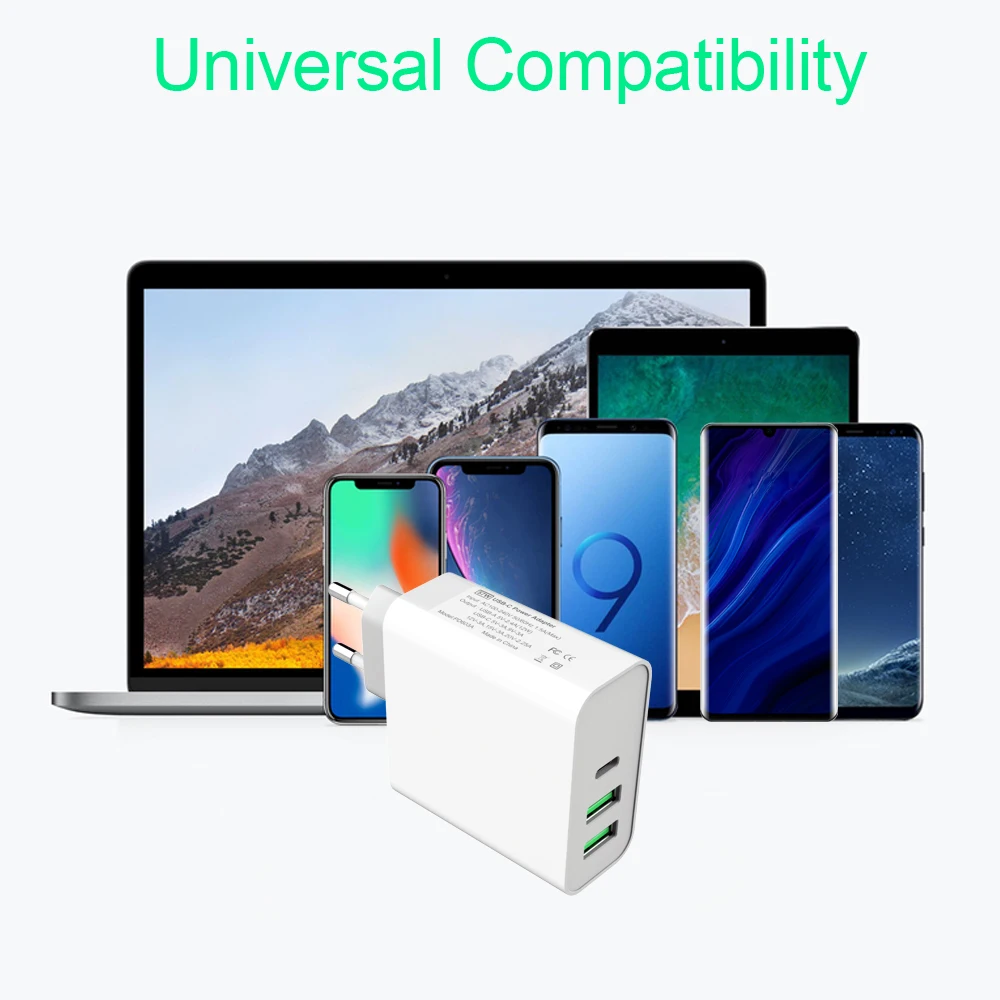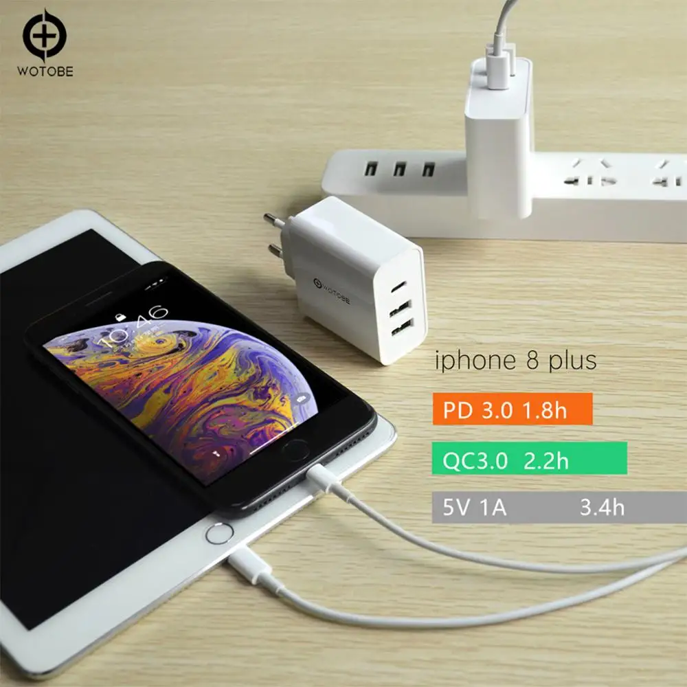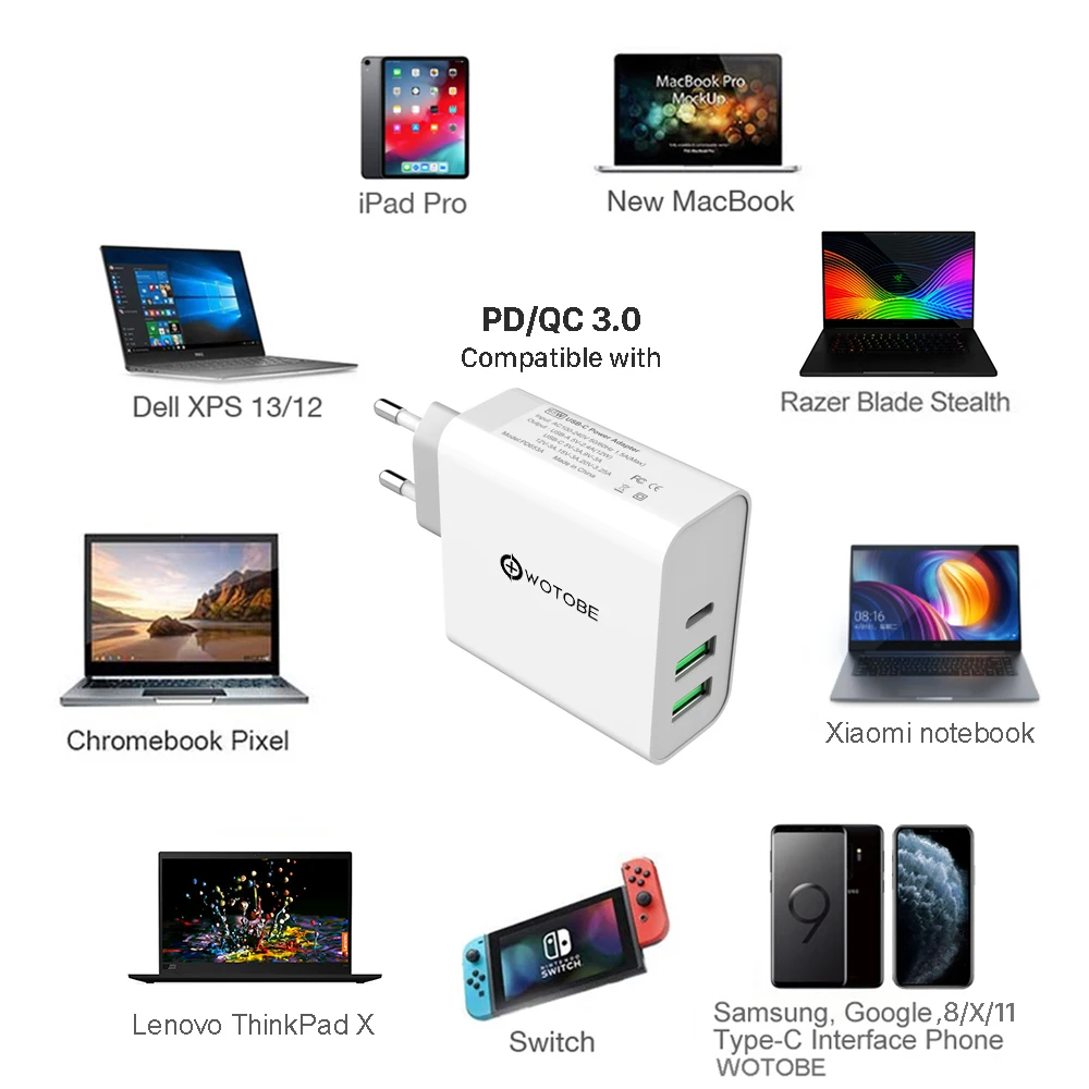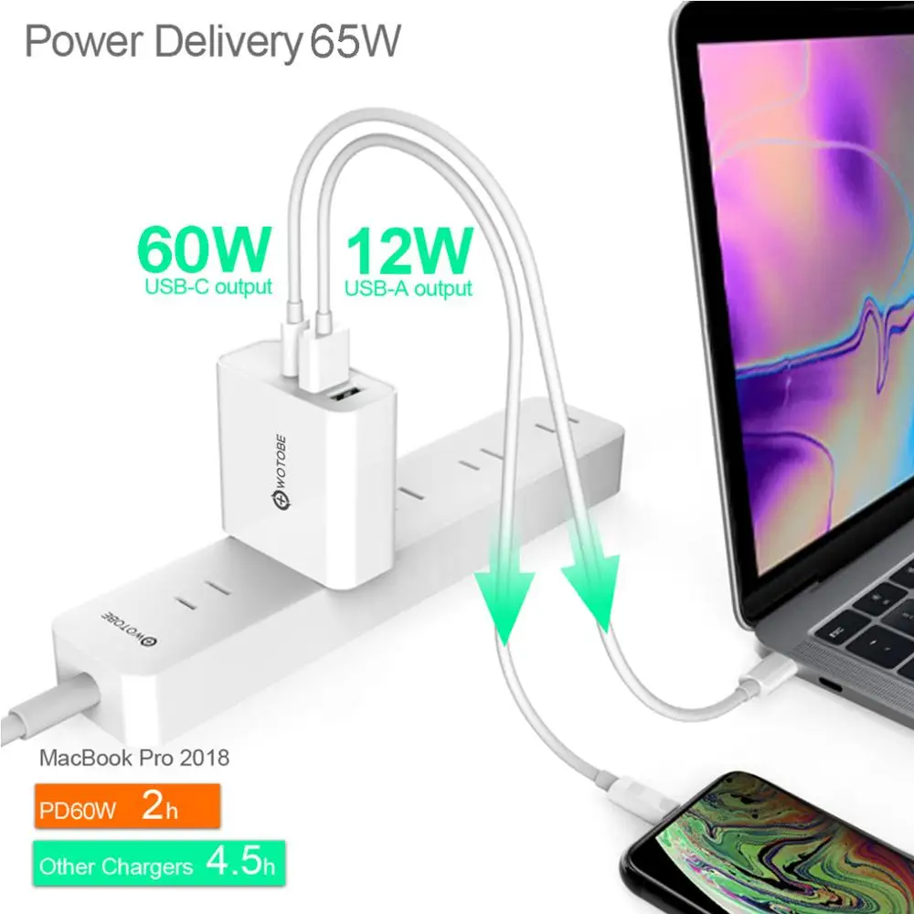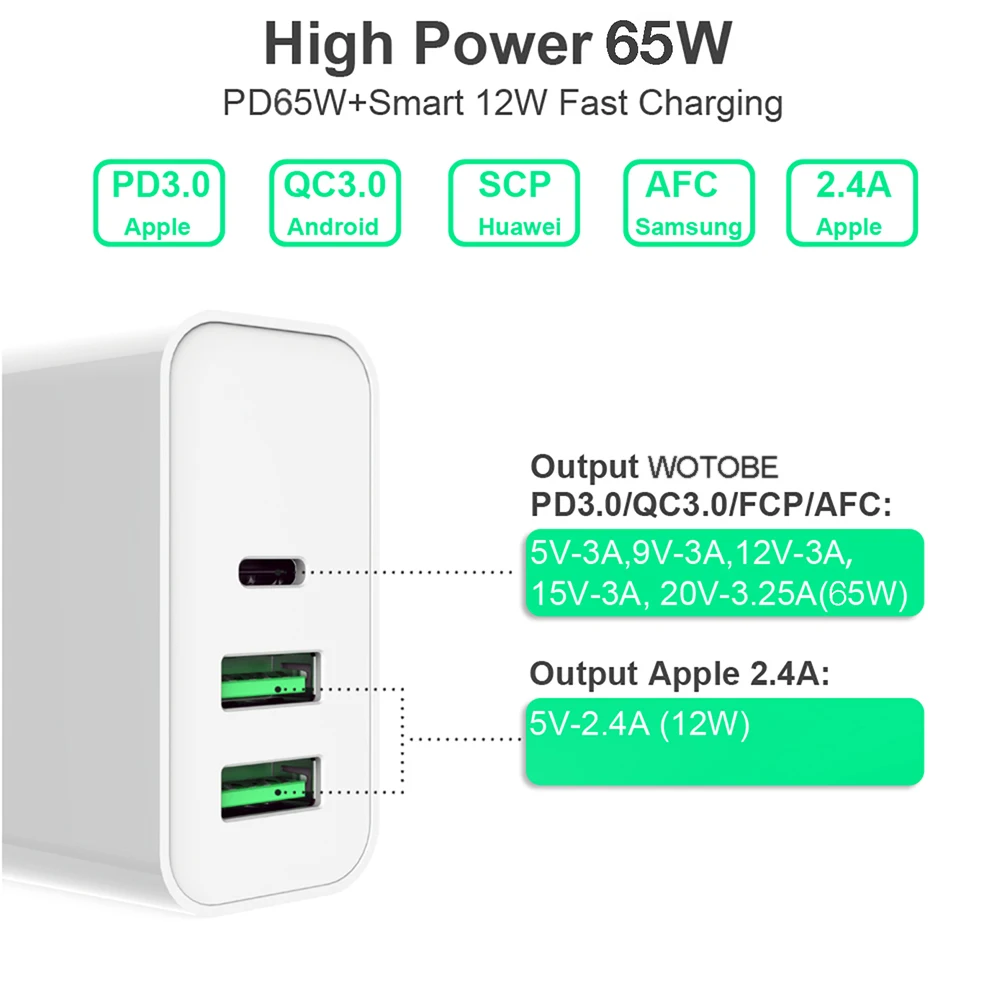 WOTOBE 3Port 65W TYPE-C USB-C adaptador de alimentación de 1 puerto USB C PD60W QC3.0 cargador para USB-C portátiles MacBook Pro/air ipad pro y 2 puerto USB para Samsung iPhone PD3.0 Max 65WTYPE-C adaptador de corriente de carga USB-C USB C adaptador de corriente PD/QC3.0 cargador de puerto de TYPE-C, para todos, cargador compacto tipo C para ordenadores portátiles USB-C/MacBook /iPad/iPhone/Samsung Galaxy, Pixel y másLa policía de cargador para Nueva MacBook Pro aire/iPhone/iPad ProAdmite carga rápida del protocolo PD y otros equiposPD3.0 teléfono celular QC TYPE-C cargador USB para MacBook Pro / DELL XPS 12/13 / Samsung Nota 8 S9 S10Nota: compatible con Samsung note10/10 + carga rápida máxima de 15WNota: los adaptadores de alimentación USB-C no hijo adequate Dell de metal superpole 5370/5390 Inspirion 7590 65 W carga de Dell de metal superpole 5370/5390 65 W los propietarios no comprarEntrada: ca 100-240V,50/60Hz, 1,5 a máx.· Un cargador rápido con compatibilidad de puertos de 65W (máx.)USB-C 65W salida:DC 5V/3A 9V/3A 12V/3A 15V/3A 20V/3.25A (máx.: 65W)USB A 1/2 de salida:Cc 5V/2,4a (máx.: 12W)· Dos Compatibilidad de puertos 62W (máx.) al cargar al mismo tiempoSalida de USB-C: 65WUSB-C + A1 de salida: 50W + 12W (W)USB-C + A2 de salida: 50W + 12W (W)USB-C + A1 + A2 de salida: W 9W + 9 + 45W (W)