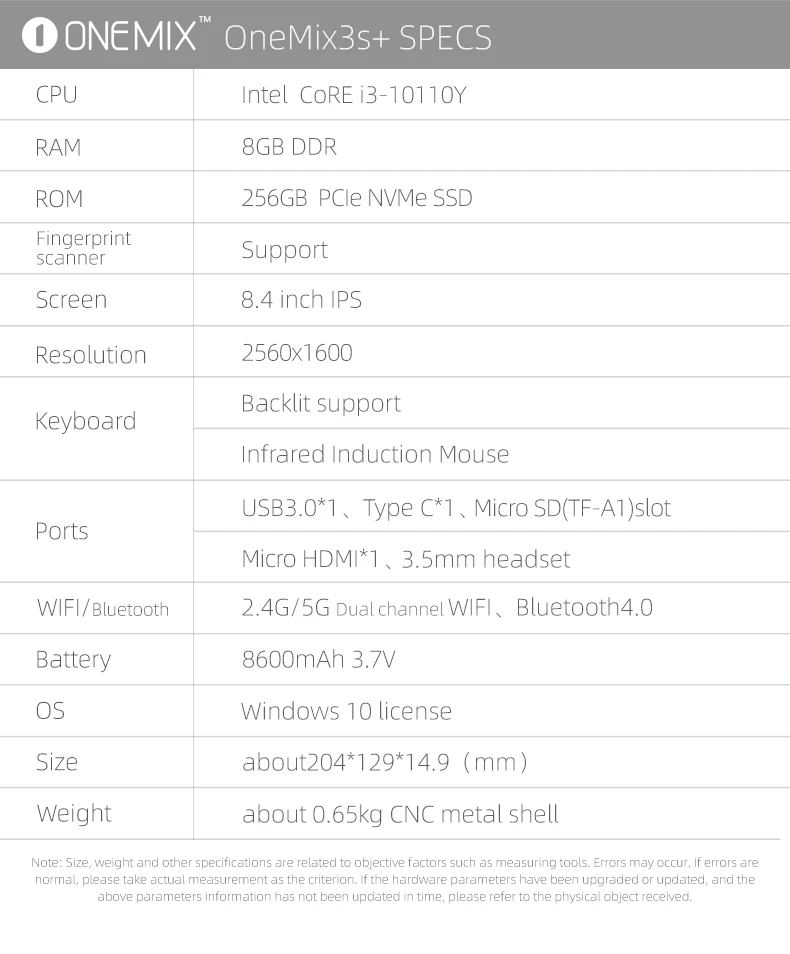 OneMix 3s portátil de 8,4 pulgadas Pantalla táctil IPS bolsillo portátiles Netbook Intel Core i3-10110Y 8G RAM 256GB SSD Windows 10