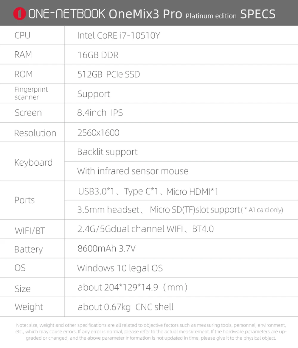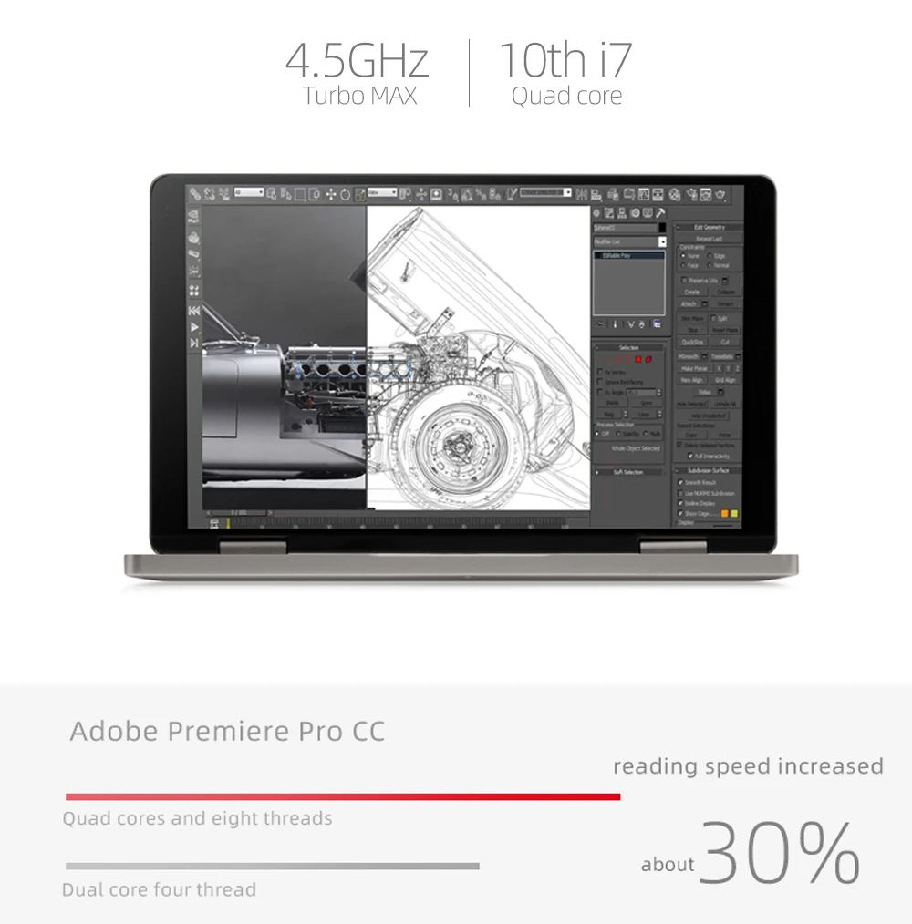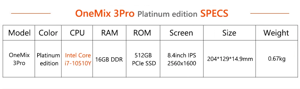 ONEMIX 3 Pro Platinum edition equipado con el núcleo de 10 ° generación i7-10510y, su rendimiento es aproximadamente un 30% más alto que el del procesador 8th generation Y, 8MB cache, frecuencia Rui de 4,5 ghz, respuesta rápida, cuatro núcleos y ocho hilos, los programas múltiples funcionan sin problemas en otros requisitos, incluso con una caculación sofisticada y compleja, Se puede manejar fácilmente.