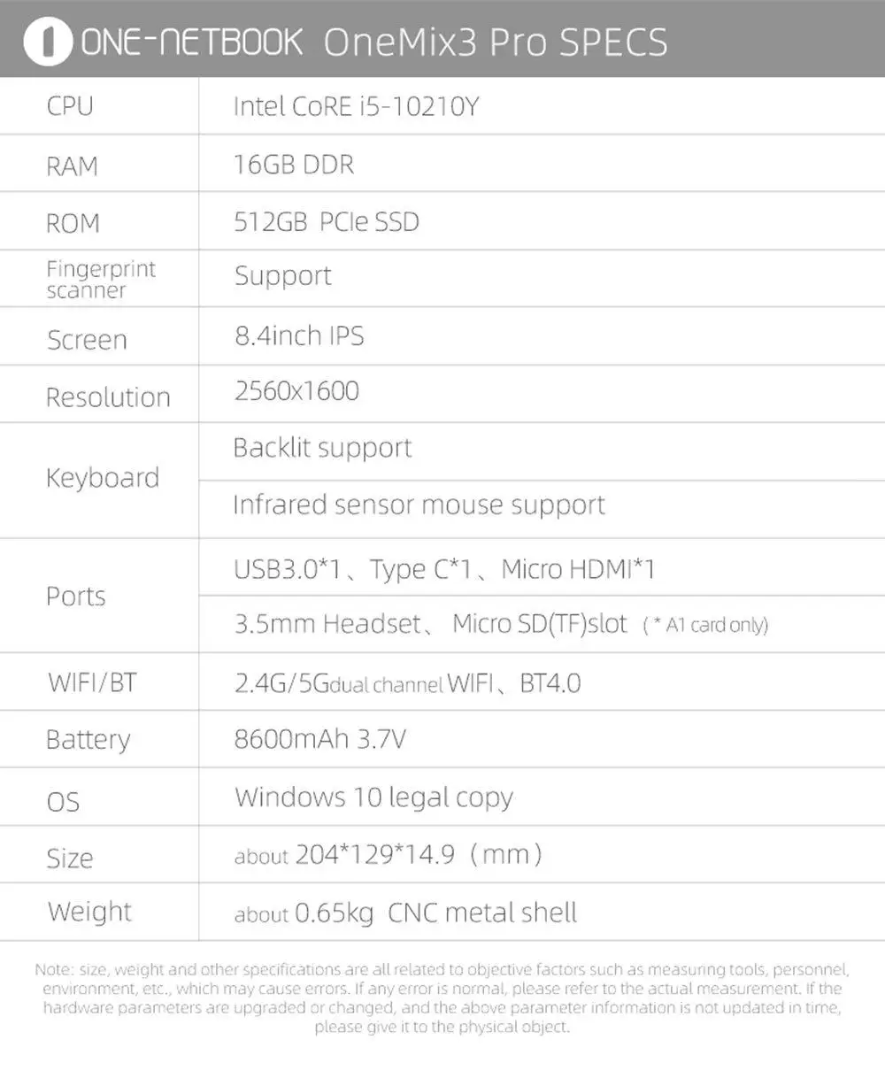 El onemix 3 Pro está equipado con los 10 DE IntelLProcesador de i5-10210y de núcleo de generación. Basado en la arquitectura new generation comet Lake, tiene un proceso de 14nm + +, con una frecuencia de CPU de 4GHz, cuatro núcleos y ocho hilos. Tiene una fuerte fuerza y ofrece una experiencia de funcionamiento más estable y suave.
