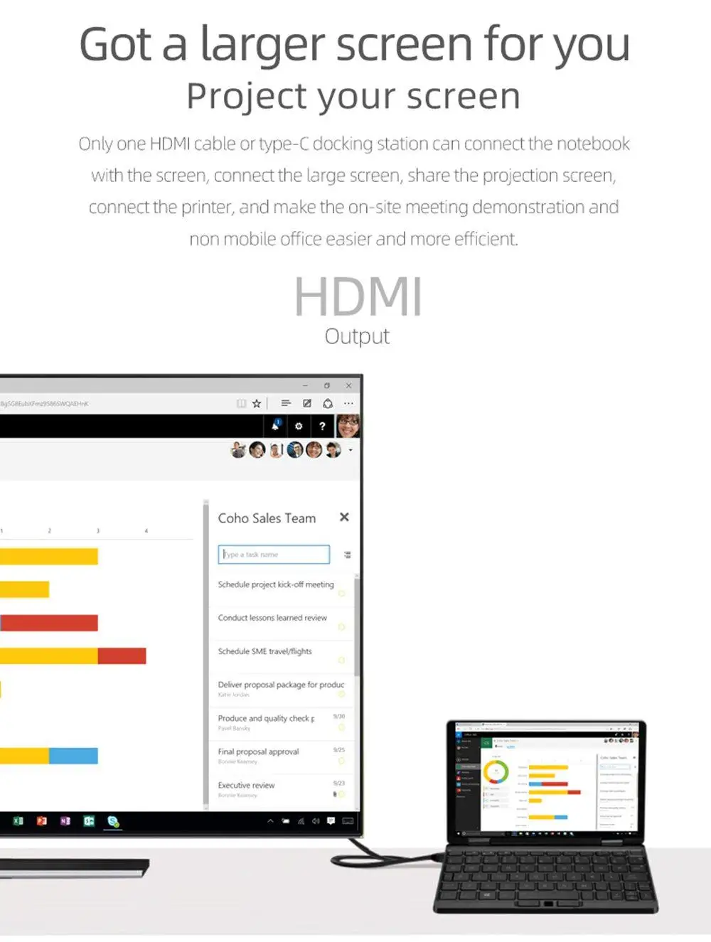 Solo un cable HDMI o una estación de doucking tipo C pueden conectar el ordenador portátil a la pantalla, conectar la pantalla grande, compartir la pantalla de proyección, conectar la impresora, Y hacer la demostración de la reunión en el lugar y la Oficina no móvil más fácil y más eficiente.