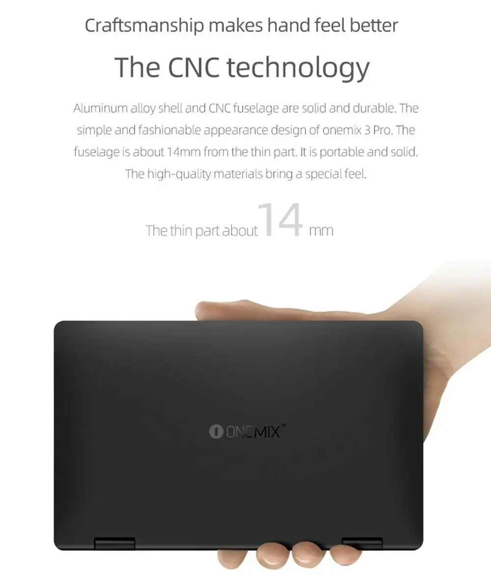 Carcasa de aleación de aluminio y fuselaje CNC son duraderos sólidos. El diseño de apariencia simple y de moda de onemix 3 Pro. El fuselaje es de aproximadamente 14mm de la parte delgada. Es portátil y sólido. Los materiales de alta calidad aportan una sensación especial.
