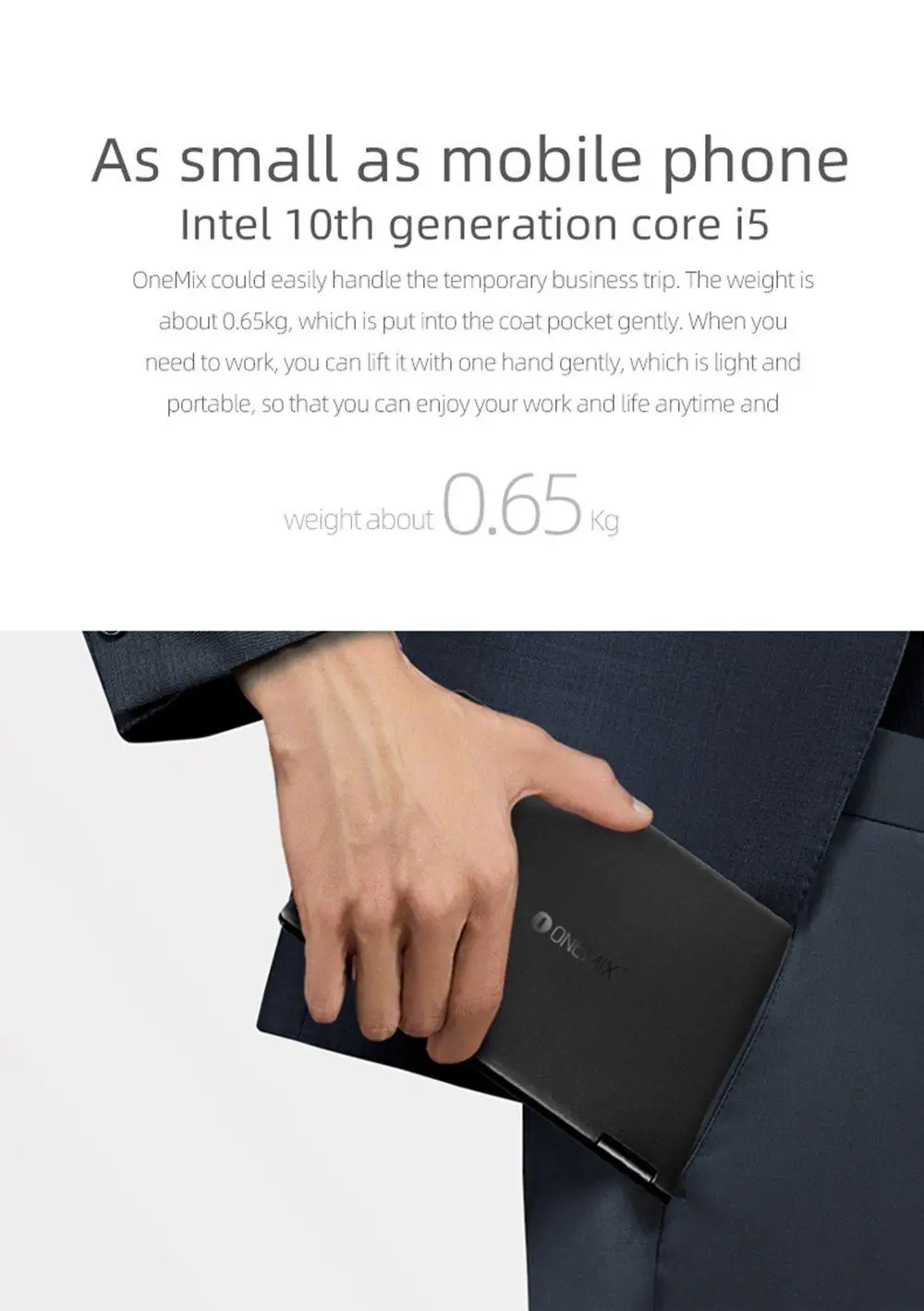 OneMix podría manejar fácilmente el viaje de negocios temporal. El peso es de aproximadamente 0,65Kg, que se coloca en el bolsillo del abrigo suavemente. Cuando necesite trabajar, puede levantarlo con una mano suavemente, que es ligero y portátil, para que pueda disfrutar de su trabajo y de su vida en cualquier momento