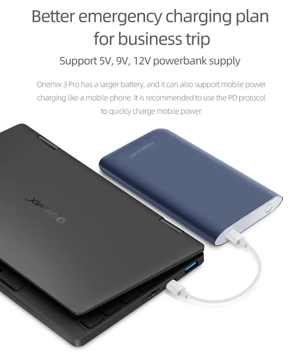 Onemix3 Pro tiene una batería más grande y también puede soportar la carga de energía móvil como un teléfono móvil. Se recomienda utilizar el protocolo PD para cargar rápidamente la energía móvil