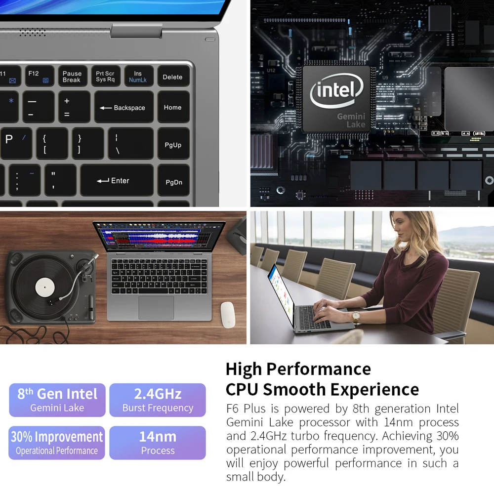 Teclast F6 Plus con un diseño plegable de 360 grados, la nueva solución para portátil combina la facilidad de uso de la tableta táctil. Es cómodo de usar tanto para el trabajo como para el estudio.