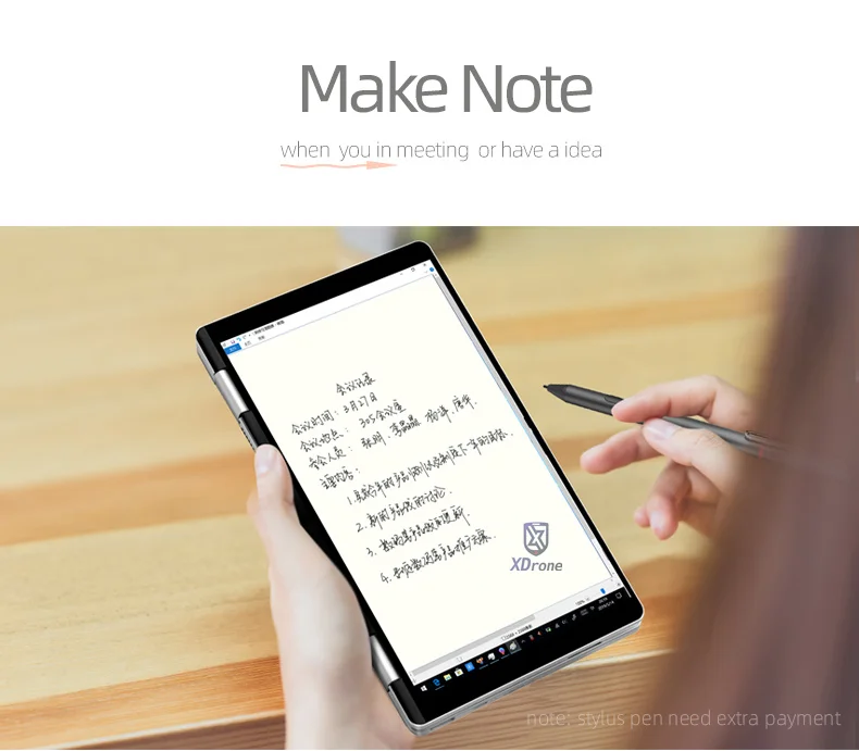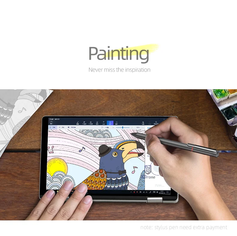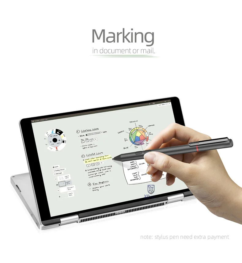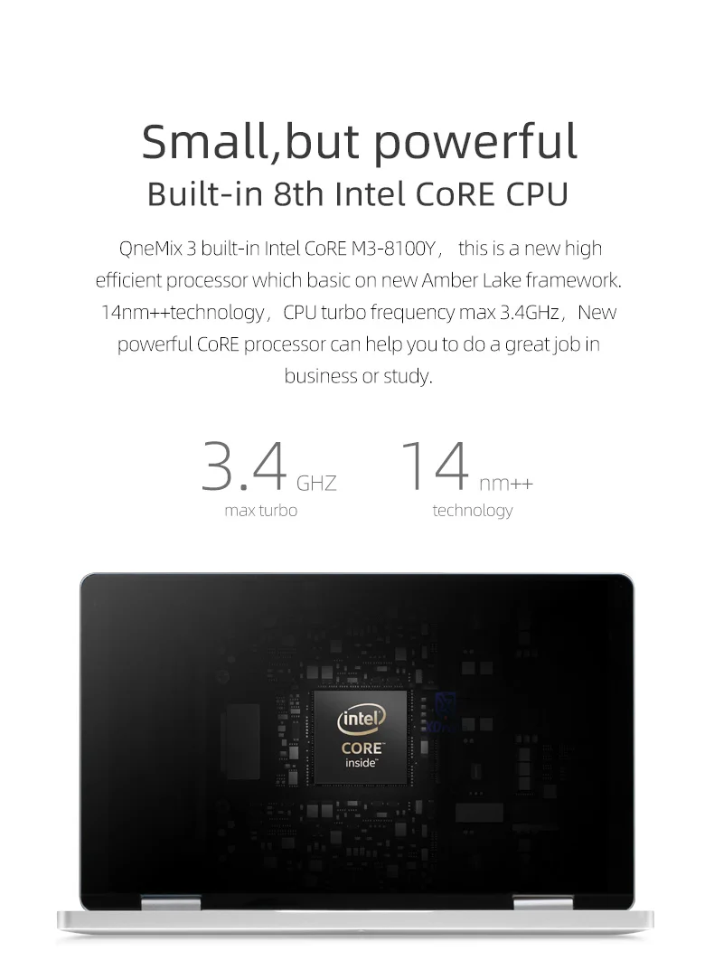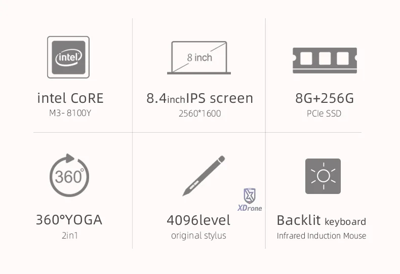CPU: Intel Core M3-8100Y doble núcleo 3,4 GHz Max 	El procesador extremadamente capaz permite a los usuarios de toda naturaleza ser los jugadores o diseñadores, para usarlo a todo su potencial. 	GPU: Intel HD Graphics 615 	Los gráficos en el procesador con memoria de vídeo compartida proporcionan una alta calidad de imagen con edición de fotos básica y juegos casuales. 	Lápiz óptico con 4.096 niveles de sensibilidad a la presión 	Es compatible con un bolígrafo de superficie para ofrecer una experiencia de dibujo precisa, tal como se escribe en un papel. Dibuja, escribe y borra de forma natural sin ningún retraso entre la punta del bolígrafo y tu línea. 	8,4 "2 K con alta resolución de 2560*1600 	Una mezcla 3 utiliza la pantalla 2,5 K, que ofrece experiencias vívidas para ver vídeos y navegar por la Web. 	8600 mAh batería de gran 	Usa este portátil todo el día y la noche con una carga. 	Reconocimiento de la huella digital de sensor 	Desbloquea tu ordenador portátil con sensor de reconocimiento de huellas dactilares directamente en la interfaz de usuario, no más contraseña. 	Sistema operativo Windows 10 	Equipado con el último sistema operativo Windows 10 original con actualizaciones de software actualizadas. 	Nota: El bolígrafo táctil no está incluido en el kit, la imagen es solo de referencia.	 Paquete estándar