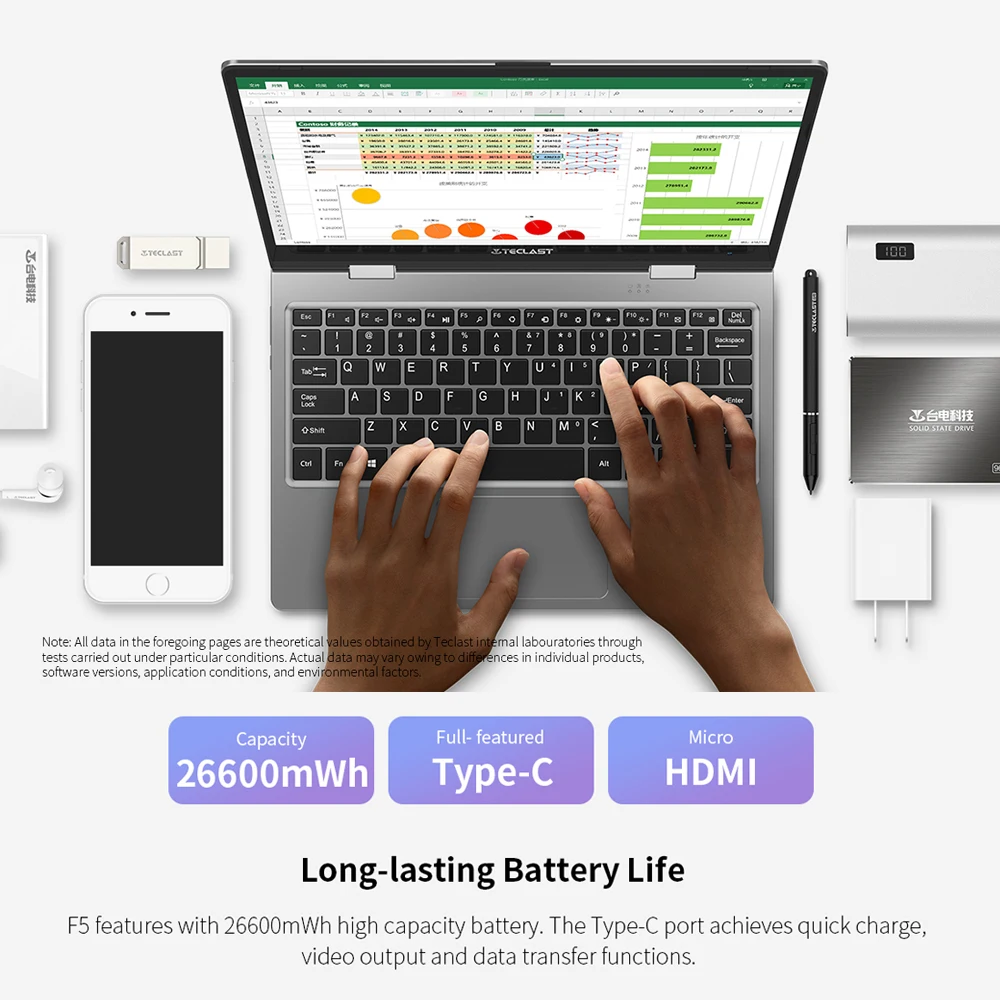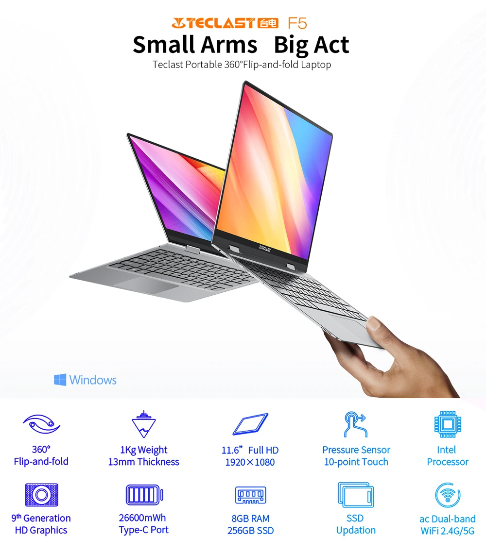 Teclast F5 con un diseño plegable de 360 grados, la nueva solución para portátil combina la facilidad de uso de la tableta táctil. Es cómodo de usar tanto para el trabajo como para el estudio.