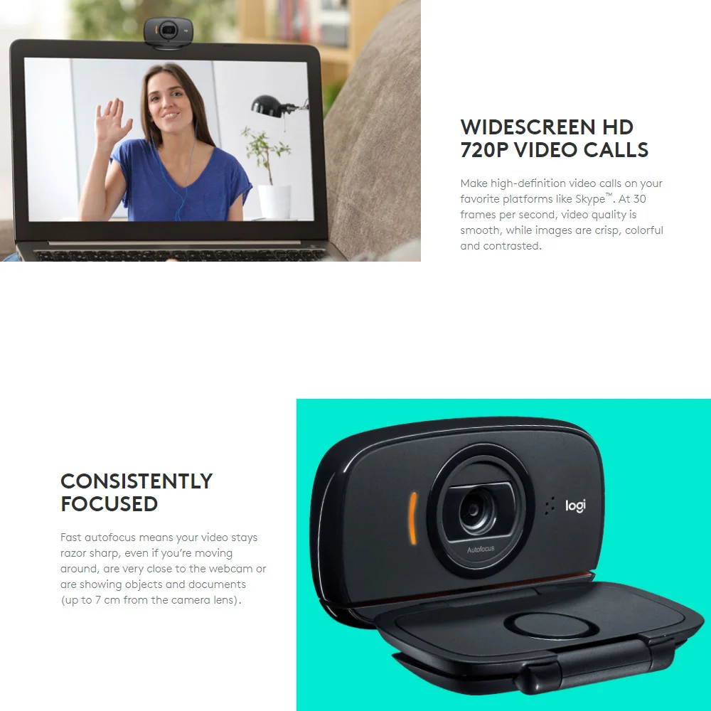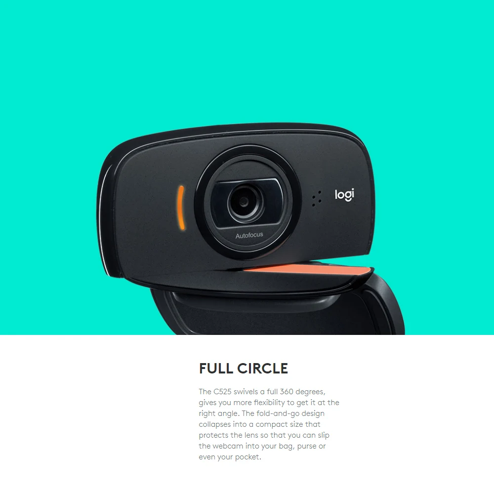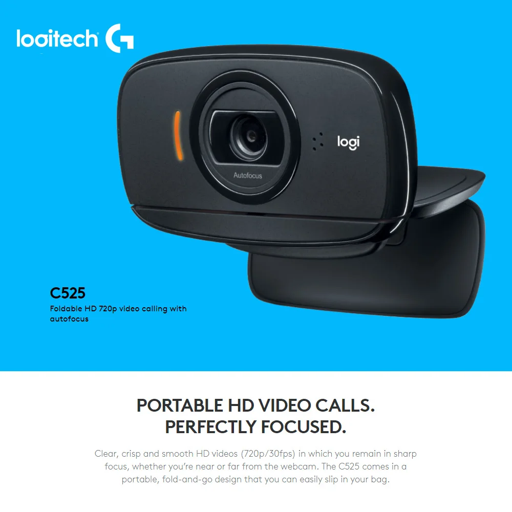 Vídeos HD claros, nítidos y suaves (720p/30fps) en los que te mantendrás en un enfoque agudo, ya estés cerca o lejos de la cámara web. El C525 viene en un diseño portátil y plegable que puedes deslizar fácilmente en tu bolsa.